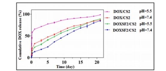 在負(fù)載方面,SFNPs 表面與疏水性氨基酸殘基的相互作用及靜電引力促使 DOX 負(fù)載,且其載藥量高(15% w/w 時(shí),DL 達(dá) 12.38±1.73% ,EE 達(dá) 95.3±2.01%)。釋放研究中,模擬癌細(xì)胞環(huán)境,監(jiān)測(cè) 21 天發(fā)現(xiàn) DOX 在 pH 7.4 時(shí)緩慢釋放,pH 5.5 時(shí)大量釋放,如 DOX/CS2 在 pH 5.5 釋放最快,這是因?yàn)榈?pH 下 CS 中氨基質(zhì)子化致溶脹、DOX 離子化增強(qiáng)。而 pH 5.5 時(shí) DOX 從 SFNPs 釋放增加,或因酸性環(huán)境影響 SFNPs 穩(wěn)定性及與 DOX 的相互作用。DOXSF2/CS2 釋放速率比 DOX/CS2 慢,精準(zhǔn)控制釋放速率可減少對(duì)健康組織影響,保證癌細(xì)胞對(duì)治療藥物的持續(xù)接觸 。(圖7)