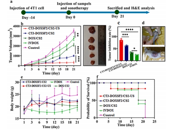 通過(guò)對(duì)患有 4T1 腫瘤的雌性 BALB/c 小鼠進(jìn)行實(shí)驗(yàn),評(píng)估了 DOX/CS2 和 CT3 - DOXSF2/CS2 的抗腫瘤效果、全身毒性及生存率情況。在抗腫瘤效果方面,對(duì)照組腫瘤生長(zhǎng)迅速,CT3 - DOXSF2/CS2 - US 組腫瘤體積減小最明顯,超聲激活 CT 納米顆粒產(chǎn)生的 ROS 與腫瘤體積減小有關(guān),第 3 天起不同治療組間陸續(xù)出現(xiàn)顯著差異,DOX 從 DOXSFNPs 的控釋提高了療效,體現(xiàn)出局部遞送 DOX 的優(yōu)勢(shì)。全身毒性實(shí)驗(yàn)中,靜脈注射 DOX 使小鼠體重下降,而 CT3 - DOXSF2/CS2 - US 和 CT3 - DOXSF2/CS2 組體重穩(wěn)定,顯示出較低毒性。生存率上,CT3 - DOXSF2/CS2 組在 21 天內(nèi)無(wú)死亡,CT3 - DOXSF2/CS2 - US 組第 6 天出現(xiàn) 1 例死亡,靜脈注射 DOX 組平均生存率為 18 天 。