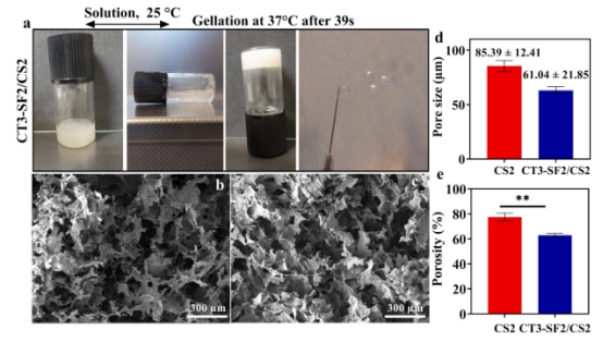 通過(guò)在 CS 中摻入 GP 得到溫度敏感型水凝膠 CT3 - SF2/CS2。這種水凝膠在 25°C 時(shí)能以溶液狀態(tài)用注射器注射,37°C 時(shí)發(fā)生凝膠化。FE - SEM 顯示 CS2 水凝膠具連通多孔微觀結(jié)構(gòu),利于水和藥物或細(xì)胞滲透負(fù)載,是藥物遞送和組織工程的潛在材料。理想抗腫瘤水凝膠需特定孔徑和孔隙率范圍,實(shí)驗(yàn)測(cè)得 CS2 和 CT3 - SF2/CS2 凍干水凝膠平均孔徑分別為 85.39±12.41μm 和 61.04±21.85μm,添加 SFNPs/CT 使孔徑減?。≒ = 0.0038);二者平均孔隙率分別約 79.25% 和 63.42%,CT3 - SF2/CS2 孔隙率降低是因 SF 與 CS 間形成氫鍵致結(jié)構(gòu)致密,因其孔隙率在可接受范圍,故適用于局部抗腫瘤應(yīng)用。(圖5)