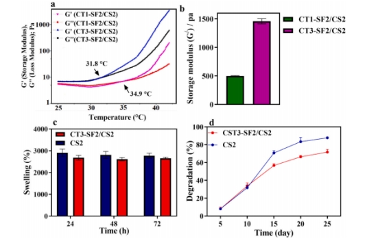 接著,本研究指出 CS 的流變學(xué)特性與凝膠化溫度受濃度、pH 及添加劑等因素影響,DOXSFNPs 和Cu - TiO?納米顆粒分別通過(guò)靜電、氫鍵、配位及范德華力等與 CS 相互作用。經(jīng)實(shí)驗(yàn)發(fā)現(xiàn),1%(w/w)的 SFNPs 濃度對(duì)凝膠化時(shí)間最佳,增加 CT 含量會(huì)降低凝膠化溫度、提升模量與交聯(lián)密度,且 CT3 - SF2/CS2 樣品粘彈性增強(qiáng),其G'/G''比值增大,材料行為趨近彈性,CT 還可能影響復(fù)合材料拉伸強(qiáng)度與模量。在溶脹率方面,37°C 的 PBS 中,CS2 和 CT3 - SF2/CS2 水凝膠 24 小時(shí)內(nèi)達(dá)最大溶脹,添加 SFNPs 和 CT 降低了溶脹百分比,但統(tǒng)計(jì)學(xué)上不顯著。降解率監(jiān)測(cè)顯示,從第 10 天起,CT3 - SF2/CS2 樣品降解速率低于 CS,這是因?yàn)?SFNPs 和 CTNPs 與 CS 的分子作用改變了水凝膠交聯(lián)密度和網(wǎng)絡(luò)結(jié)構(gòu),進(jìn)而影響降解行為。(圖4)