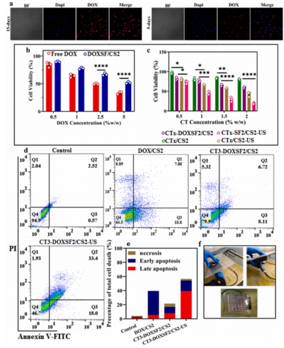 接著,通過(guò)多種實(shí)驗(yàn)研究了含 CT 和 DOX 的水凝膠對(duì) MCF - 7 細(xì)胞的作用及機(jī)制。MTT 實(shí)驗(yàn)表明,DOXSF2/CS2 的細(xì)胞毒性低于游離 DOX,體現(xiàn)了其對(duì) DOX 的控釋作用;CTx/CS2 對(duì)細(xì)胞無(wú)明顯毒性,CT4/CS2 - US 因超聲下 CT 產(chǎn)生 ROS 而表現(xiàn)出顯著毒性,CTx - DOXSF2/CS2 - US 的抗癌效果比 CTx - DOXSF2/CS2 更顯著,CT3 - DOXSF2/CS2 - US 的 IC50 更低,且 CT 濃度增加會(huì)加大照射與未照射配方的差異。Annexin V/PI 雙染法驗(yàn)證 MTT 結(jié)果,發(fā)現(xiàn) CT3 - DOXSF2/CS2 - US 處理的細(xì)胞凋亡率更高,CT 通過(guò)產(chǎn)生 ROS、損傷 DNA 等誘導(dǎo)凋亡,DOX/CS2 比 CT3 - DOXSF2/CS2 引發(fā)的凋亡更顯著,因?yàn)槠?DOX 釋放更快。CLSM 圖像顯示 CT3 - DOXSF2/CS2 中的 DOX 呈控釋狀態(tài)。(圖8)