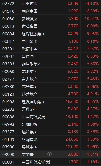 內(nèi)房股持續(xù)強(qiáng)勢(shì),中梁控股漲超14%。據(jù)報(bào)道,多個(gè)城市正在進(jìn)行房地產(chǎn)市場(chǎng)止跌回穩(wěn)相關(guān)政策的研究及儲(chǔ)備工作。如武漢市相關(guān)部門表示,正在做政策研究?jī)?chǔ)備工作,結(jié)合市場(chǎng)實(shí)際適時(shí)出臺(tái)實(shí)施,持續(xù)用力推動(dòng)房地產(chǎn)市場(chǎng)進(jìn)一步止跌回穩(wěn);佛山將持續(xù)出臺(tái)數(shù)字建造、智能建造、綠色建造相關(guān)政策,同時(shí)對(duì)穩(wěn)住樓市、持續(xù)用力推動(dòng)房地產(chǎn)市場(chǎng)止跌回穩(wěn)方面政策進(jìn)行研究。