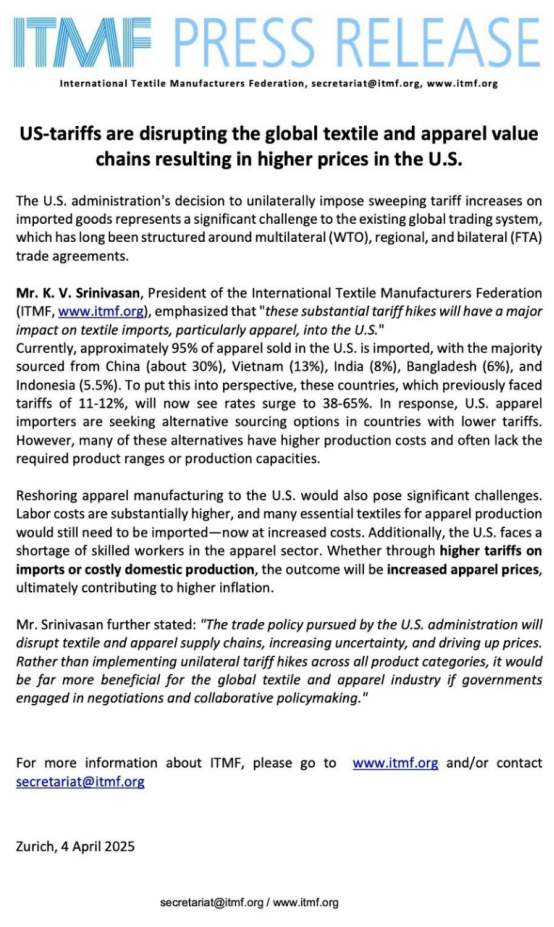 國際紡織制造商聯(lián)合會(ITMF)主席K. V. Srinivasan強調(diào):“這些大幅關(guān)稅上調(diào)將對美國紡織品進口,尤其是服裝進口產(chǎn)生重大影響?!?o:p>