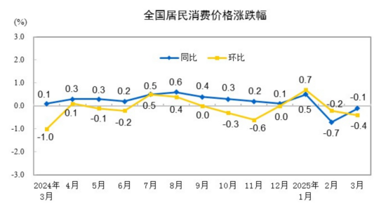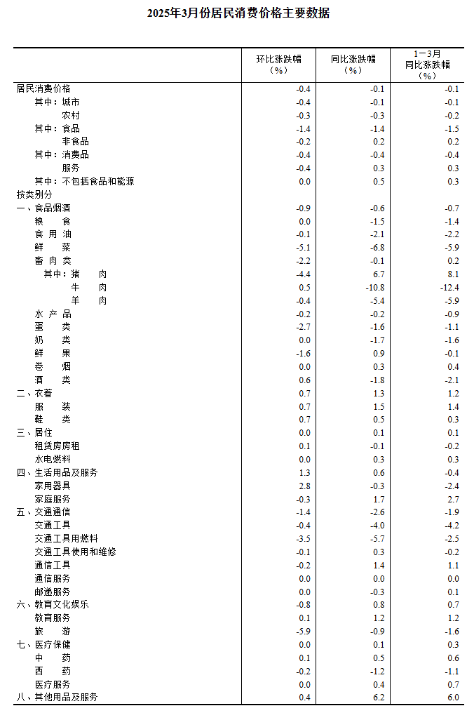 2025年3月份,全國居民消費價格同比下降0.1%。其中,城市下降0.1%,農(nóng)村下降0.3%;食品價格下降1.4%,非食品價格上漲0.2%;消費品價格下降0.4%,服務價格上漲0.3%。1—3月平均,全國居民消費價格比上年同期下降0.1%。