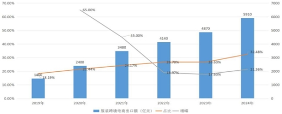 中國紡聯(lián)流通分會測算,2024年,我國服裝跨境電商出口額為5910億元,增幅為21.36%;2019-2024年,我國服裝跨境電商出口額實現(xiàn)了跨越式增長,服裝在我國跨境電商出口金額的占比也從2019年的18.19%進一步提高到2024年的32.48%,服裝品類影響力明顯提升(圖4)。