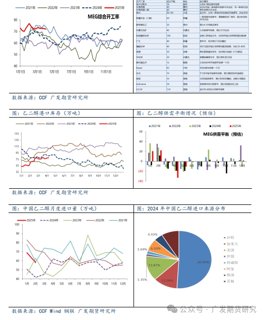 另外,國務院關稅稅則委員會4月9日發(fā)布公告,自4月10日12時01分起,對原產于美國的所有進口商品的加征關稅稅率由34%提高至84%。2024年我國進口美國乙二醇約占乙二醇總進口量的12.5%,且我國進口美國乙二醇的月度均值在8萬噸附近,由于此后對美國乙二醇加征84%的關稅,因此,預計將大幅縮減美國乙二醇的進口,乙二醇港口庫存有望去化,乙二醇總庫存4-5月去化幅度加大。