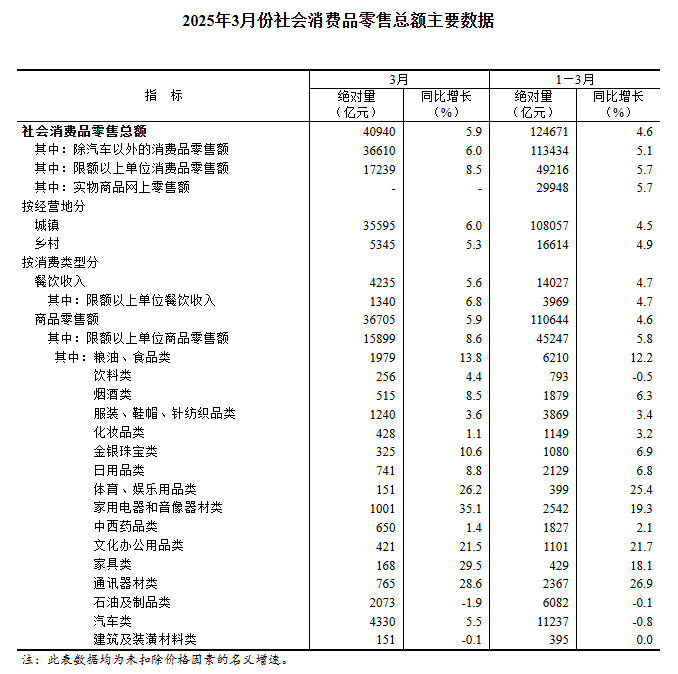 3月份,社會消費品零售總額40940億元,同比增長5.9%。其中,除汽車以外的消費品零售額36610億元,增長6.0%。1—3月份,社會消費品零售總額124671億元,同比增長4.6%。其中,除汽車以外的消費品零售額113434億元,增長5.1%。