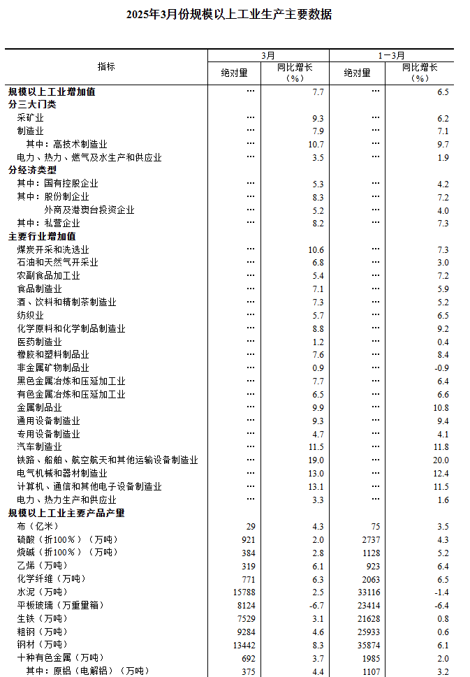 3月份,規(guī)模以上工業(yè)增加值同比實(shí)際增長7.7%(增加值增速均為扣除價(jià)格因素的實(shí)際增長率)。從環(huán)比看,3月份,規(guī)模以上工業(yè)增加值比上月增長0.44%。1—3月份,規(guī)模以上工業(yè)增加值同比增長6.5%。