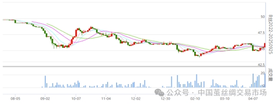 今日(2025年04月17日,周四)中國繭絲綢交易市場(chǎng)生絲電子指數(shù)上漲0.69%報(bào)收于4581.94點(diǎn)。B絲2022D(商檢4A級(jí)生絲):250425合約上漲0.06萬元報(bào)收于45.69萬元;250925合約上漲0.63萬元報(bào)收于46.17萬元;260325合約上漲0.63萬元報(bào)收于45.90萬元。