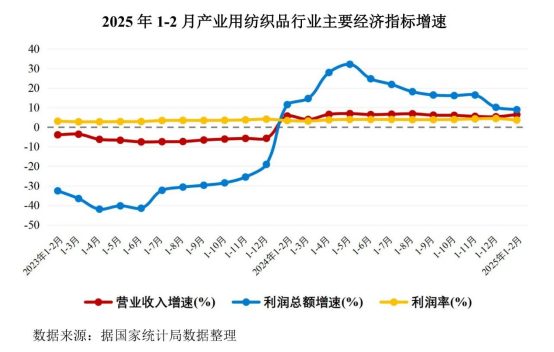 經(jīng)濟(jì)效益方面,根據(jù)國家統(tǒng)計(jì)局?jǐn)?shù)據(jù),1-2月產(chǎn)業(yè)用紡織品行業(yè)規(guī)模以上企業(yè)的營業(yè)收入與利潤總額分別同比增長6.4%和8.9%;營業(yè)利潤率為3.6%,同比增長0.1個百分點(diǎn)。行業(yè)經(jīng)濟(jì)運(yùn)行基數(shù)效應(yīng)影響漸退,逐漸回歸正常增長軌道。