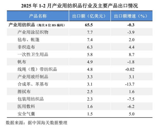 國際貿(mào)易方面,根據(jù)中國海關(guān)數(shù)據(jù)(海關(guān)8位HS編碼統(tǒng)計(jì)數(shù)據(jù)),2025年1-2月我國產(chǎn)業(yè)用紡織品行業(yè)的出口額為65.5億美元,同比下降0.3%;1-2月行業(yè)進(jìn)口額為8億美元,同比增長9.1%。