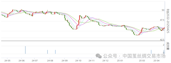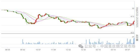 今日(2025年04月18日,周五)中國繭絲綢交易市場生絲電子指數(shù)上漲0.63%報收于4610.85點,本周生絲指數(shù)上漲2.15%。B絲2022D(商檢4A級生絲):250425合約上漲0.18萬元報收于45.87萬元;250925合約上漲0.21萬元報收于46.38萬元;260325合約上漲0.42萬元報收于46.32萬元。