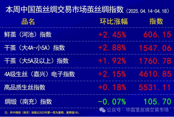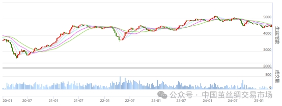 在目前廣西春蠶生產(chǎn)與春繭收購態(tài)勢帶動下,今日(周五)生絲盤面各遠近合約價格繼續(xù)有不同程度收漲。成交量在昨日基礎(chǔ)上繼續(xù)有所放大,盤面呈現(xiàn)活躍態(tài)勢。本周4A級電子指數(shù)累計上漲2.15%報收于4610.85點。
