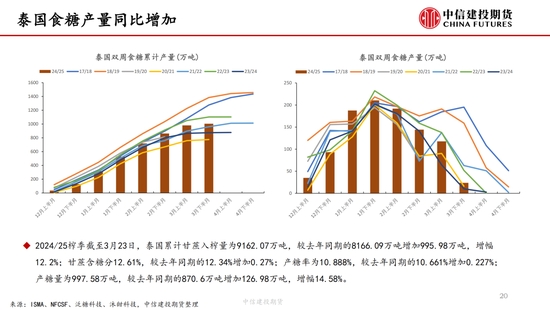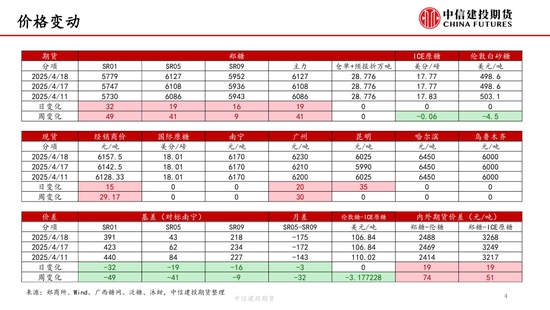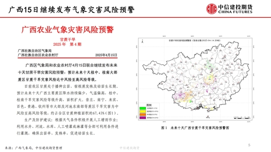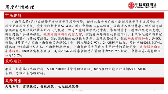 廣西氣象局4月15日繼續(xù)發(fā)布甘蔗干旱風(fēng)險預(yù)警,預(yù)計未來十天廣西中南部蔗區(qū)干旱災(zāi)害風(fēng)險達(dá)中風(fēng)險至高風(fēng)險等級,受災(zāi)面積擴大至67.43%。國內(nèi)食糖加工基本結(jié)束,逐漸進(jìn)入純銷售季。供應(yīng)端有糖漿預(yù)拌粉進(jìn)口政策收緊和廣西天氣擾動,但海外受特朗普關(guān)稅沖擊,市場對需求下滑的擔(dān)憂逐漸發(fā)酵,糖價內(nèi)強外弱格局強化。短期看國內(nèi)糖價尚有支撐,但隨著海外糖價的持續(xù)下行,未來不乏進(jìn)口糖折配額外利潤窗口打開的可能性,因此國內(nèi)糖價也難獨善其身,后續(xù)走勢偏多,但波動或有所加劇。UNICA數(shù)據(jù),3月下半月巴西中南部地區(qū)產(chǎn)糖20.1噸,同比增加9.97%。24/25榨季結(jié)束,累計產(chǎn)糖4016.9萬噸,同比前一榨季減少5.31%。巴西新榨季開啟,中南部地區(qū)天氣成為主導(dǎo)行情的關(guān)鍵變量,定價錨點向南半球轉(zhuǎn)移。USDA供需報告顯示,美國2024/25榨季食糖總產(chǎn)量預(yù)計為936.9萬短噸,食糖庫存/消費比預(yù)估為16.2%。