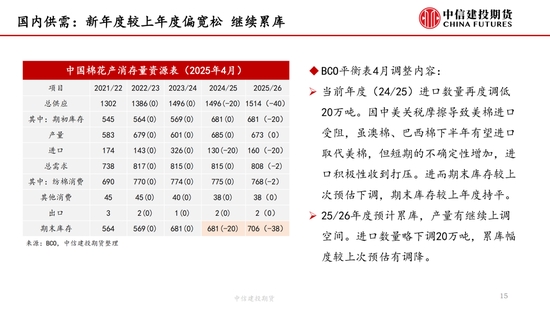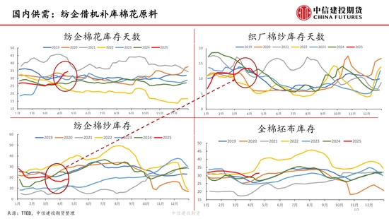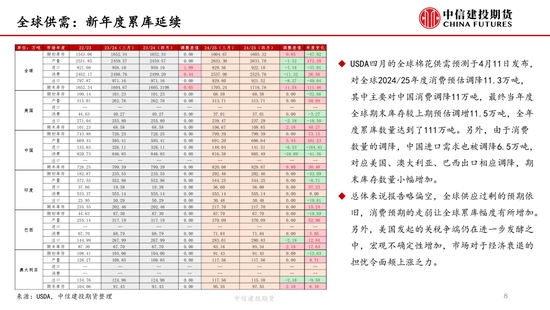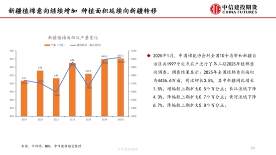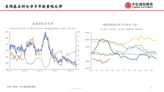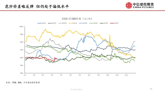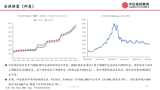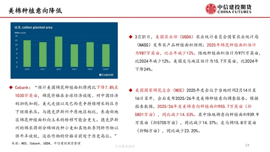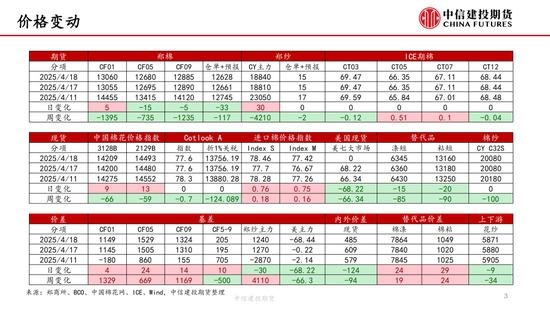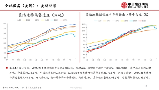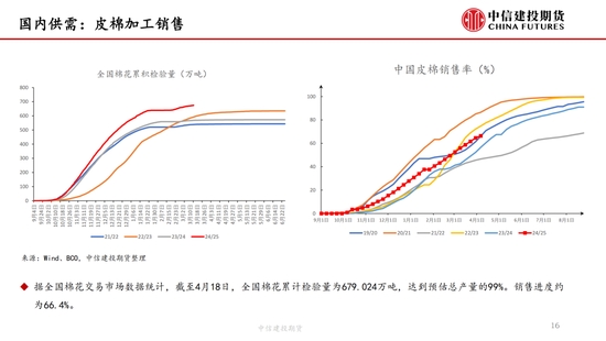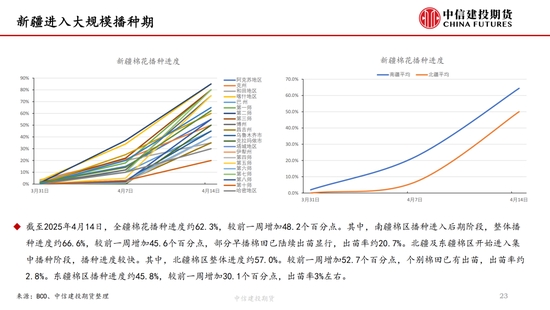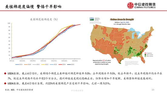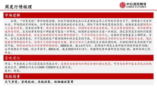 本周,“對等關(guān)稅”事件繼續(xù)發(fā)酵,但在中國強(qiáng)硬反擊以及美債收益率上升等的多重壓力下,特朗普口風(fēng)有所松動(dòng),市場情緒有所緩和,但市場對經(jīng)濟(jì)衰退的擔(dān)憂并未消失,棉紡下游市場觀望情緒濃厚。短期來看我國棉花(14690, -40.00, -0.27%)加工已基本結(jié)束,迎來純消費(fèi)季,商業(yè)庫存數(shù)據(jù)維持高位,但因部分庫存成本較高,貨主出售意愿較低,實(shí)際能夠流通庫存有限,且關(guān)稅帶來的進(jìn)口棉數(shù)量可能進(jìn)一步降低,短期供應(yīng)端的壓力進(jìn)一步減弱,因此雖然需求端的問題固然凸顯,但短期來看,在未出現(xiàn)新的突發(fā)風(fēng)險(xiǎn)事件前提下,下方空間或已經(jīng)不大,近期現(xiàn)貨銷售基差上調(diào)明顯。另外,若目光看得更遠(yuǎn),不可忽視的是產(chǎn)量預(yù)期增加結(jié)合需求的不振,中長期的壓力依然如灰犀牛般緩步走來,因此隨著新棉種植的開啟,后續(xù)天氣的影響越發(fā)關(guān)鍵,若北半球天氣在棉花生長期風(fēng)調(diào)雨順,不排除棉價(jià)未來繼續(xù)下探的可能,棉價(jià)驅(qū)動(dòng)向北半球新棉種植轉(zhuǎn)移。USDA數(shù)據(jù),截止4月13日,美棉15個(gè)棉花主要種植州棉花種植率為5%;去年同期水平為5%,較去年持平。BCO數(shù)據(jù),截至2025年4月14日,新疆棉花整體播種進(jìn)度約62.3%,播種高峰已然開啟。
