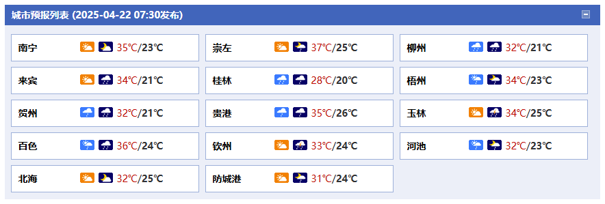 南寧市:今天白天到晚上,多云、局地有陣雨或雷雨,偏南風(fēng)2到3級,最高氣溫35℃,最低氣溫23℃。