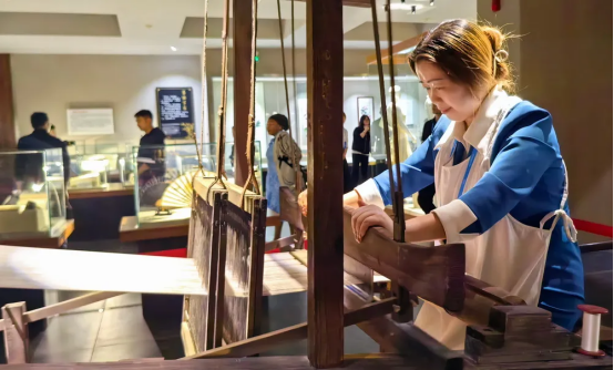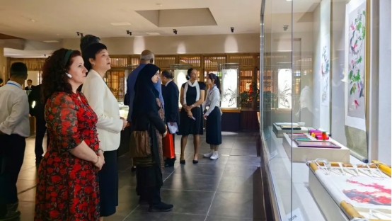 在順成公司董事長趙燕輝的陪同下,使節(jié)團(tuán)先后參觀了織綢車間、服裝車間、民族服飾博物館及蜀繪文化博物館。在織綢車間,大使們近距離觀摩了傳統(tǒng)絲綢織造工藝與現(xiàn)代智能化生產(chǎn)的融合實(shí)踐;蜀繪文化博物館內(nèi),非遺大師現(xiàn)場(chǎng)演示了“以綢為紙、以針為筆”的蜀繪技藝,引得使節(jié)們頻頻駐足贊嘆。隨后,旗袍定制工坊的個(gè)性化設(shè)計(jì)與精湛工藝,進(jìn)一步展現(xiàn)了中國絲綢文化的深厚底蘊(yùn)與創(chuàng)新活力。參觀過程中,公司王總詳細(xì)介紹了順成公司如何通過“非遺+產(chǎn)業(yè)”模式助力鄉(xiāng)村振興,將蠶桑養(yǎng)殖、絲綢制造與文旅融合,帶動(dòng)當(dāng)?shù)財(cái)?shù)千農(nóng)戶增收。