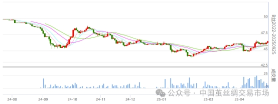 今日(2025年04月29日,周二)中國繭絲綢交易市場生絲電子指數(shù)上漲0.28%報收于4637.00點。B絲2022D(商檢4A級生絲):250525合約上漲0.03萬元報收于46.26萬元;250925合約上漲0.24萬元報收于46.50萬元;260325合約上漲0.27萬元報收于46.41萬元。