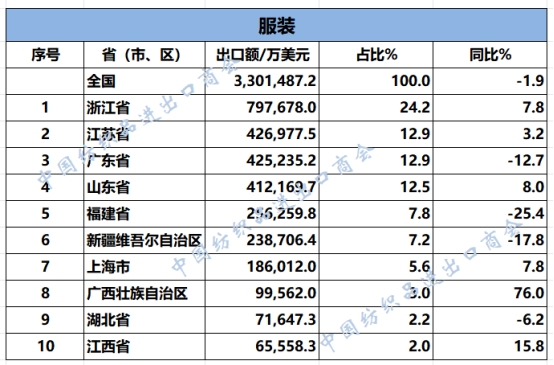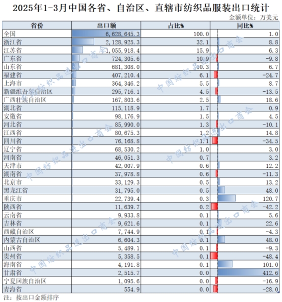 2025年1-3月我國(guó)紡織服裝重點(diǎn)省市出口概況