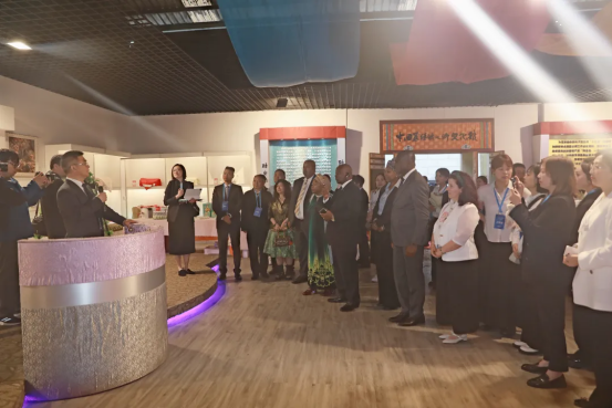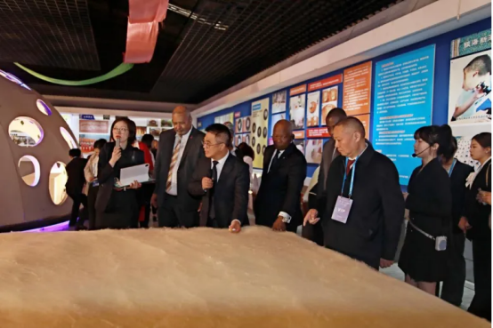 代表團在何國君總經(jīng)理陪同下參觀了“中國蠶絲被之鄉(xiāng)”文化館,這是中國第一家以蠶絲被作為主題的絲綢文化館,代表們詳細(xì)了解了南充絲綢的悠久歷史以及蠶絲被行業(yè)的發(fā)展歷程。館內(nèi)銀海絲綢蠶娘現(xiàn)場演示了手工撥繭制網(wǎng)兜工藝,喀麥隆共和國大使夫人饒有興趣跟著蠶娘手工撥繭制網(wǎng)兜,體驗了東方絲綢文化的魅力。何國君總經(jīng)理向客人介紹了彩色繭黃金被的相關(guān)情況,得知彩色繭未經(jīng)過染色,大使們表現(xiàn)出濃厚的興趣,并對中國在蠶桑絲綢領(lǐng)域的技術(shù)創(chuàng)新成果贊嘆不已。