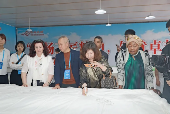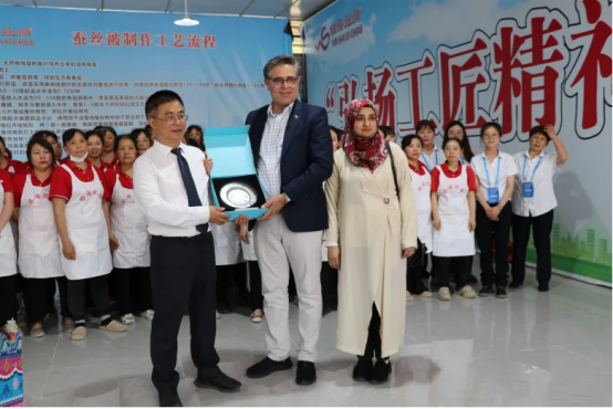 嘉賓代表喀麥隆共和國駐華大使馬丁·姆巴納、佛得角共和國駐華大使阿林多·納西門托·多·羅薩里奧、幾內(nèi)亞共和國駐華大使阿米娜塔·科伊塔、喀麥隆共和國駐華大使馬丁·姆巴納、佛得角共和國駐華大使阿林多·納西門托·多·羅薩里奧、幾內(nèi)亞共和國駐華大使阿米娜塔·科伊塔、巴基斯坦伊斯蘭共和國駐華大使哈利勒·烏爾·拉赫曼·哈什米一行來到銀海絲綢公司。公司總經(jīng)理何國君向多國駐華大使的到來表示熱誠歡迎,并介紹到嘉陵區(qū)在2019年獲得“中國蠶絲被之鄉(xiāng)”稱號,銀海絲綢專注蠶絲被研發(fā)生產(chǎn)銷售,在大通鎮(zhèn)建有5000余畝桑園,年產(chǎn)蠶絲被30萬床,是四川最大蠶絲被加工企業(yè)。銀海手工蠶絲被是嘉陵區(qū)非遺品牌,堅持手工拉絲工藝,接下來我們將邀請各位嘉賓一起體驗蠶絲被制作。