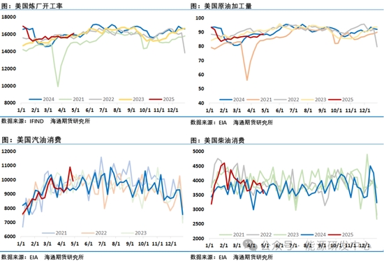 從EIA周度數(shù)據(jù)來看,近幾周美國汽油消費表現(xiàn)明顯好于去年,這讓汽油表現(xiàn)明顯強于原油,帶動了煉油毛利的反彈。而中國市場原油加工量持續(xù)低于去年同期,尤其是柴油消費較去年同期有大幅下滑,新能源銷售維持高增長,對成品油消費仍形成了明顯的替代。