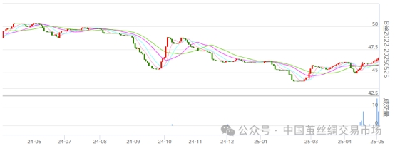 今日(2025年05月06日,周二)中國繭絲綢交易市場生絲電子指數(shù)上漲0.22%報收于4660.17點。B絲2022D(商檢4A級生絲):250525合約上漲0.12萬元報收于46.53萬元;250925合約上漲0.18萬元報收于46.95萬元;260325合約上漲0.15萬元報收于46.65萬元。