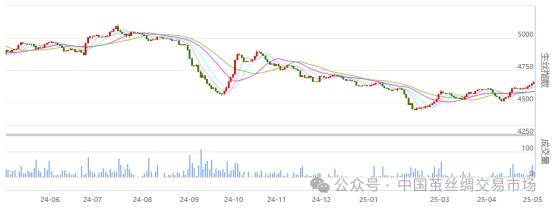 今日風向標廣西宜州的首批春繭處于尾繭期,今日價格多在每公斤60-64元左右收購。生絲方面,5月以來,繅絲企業(yè)走貨價格和上周相差不大。