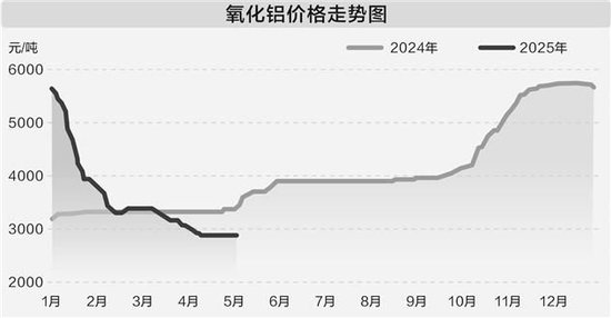 加速下跌后,氧化鋁市場(chǎng)當(dāng)前維持震蕩弱勢(shì)格局。截至5月6日,國內(nèi)期貨市場(chǎng)氧化鋁主力合約最低報(bào)2664元/噸,較2024年10月末4196元/噸的高點(diǎn)已跌超36%。