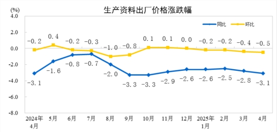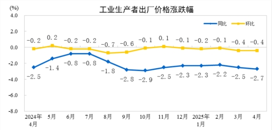 2025年4月份,全國(guó)工業(yè)生產(chǎn)者出廠價(jià)格同比下降2.7%,環(huán)比下降0.4%;工業(yè)生產(chǎn)者購(gòu)進(jìn)價(jià)格同比下降2.7%,環(huán)比下降0.6%。1—4月平均,工業(yè)生產(chǎn)者出廠價(jià)格和購(gòu)進(jìn)價(jià)格比上年同期均下降2.4%。