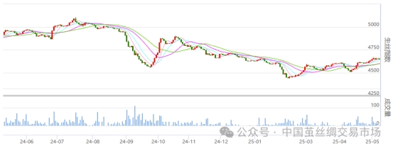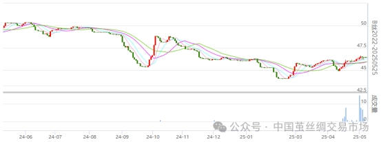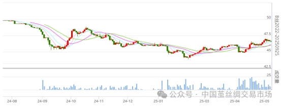 今日(2025年05月12日,周一)中國繭絲綢交易市場生絲電子指數(shù)下跌0.11%報(bào)收于4650.41點(diǎn)。B絲2022D(商檢4A級(jí)生絲):250525合約報(bào)平收于46.44萬元;250925合約下跌0.06萬元報(bào)收于46.62萬元;260325合約下跌0.09萬元報(bào)收于46.32萬元。