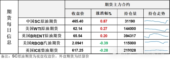 【1】WTI主力原油期貨收漲0.17美元,漲幅0.27%,報(bào)62.14美元/桶;布倫特主力原油期貨收漲0.13美元,漲幅0.2%,報(bào)65.54美元/桶;INE原油期貨收漲0.87%,報(bào)465.4元。
