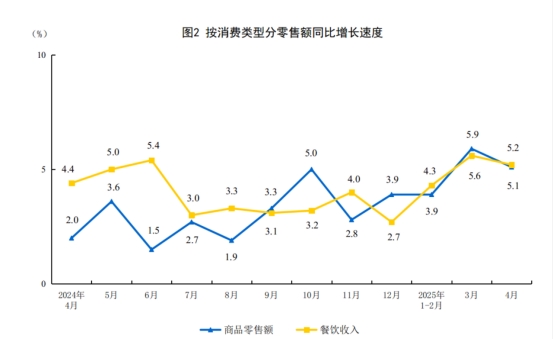 按消費(fèi)類型分,4月份,商品零售額33007億元,同比增長(zhǎng)5.1%;餐飲收入4167億元,增長(zhǎng)5.2%。1—4月份,商品零售額143651億元,增長(zhǎng)4.7%;餐飲收入18194億元,增長(zhǎng)4.8%。