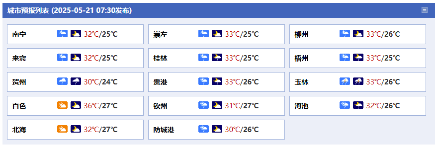 南寧市:今天白天,多云有陣雨或雷雨,今天晚上,多云、局地有陣雨,偏南風(fēng)2級,最高氣溫32℃,最低氣溫25℃。