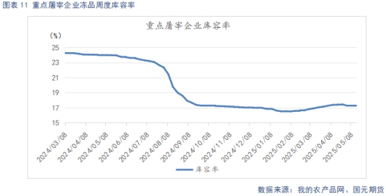 截止5月20日,重點(diǎn)屠宰企業(yè)開(kāi)工率為28.51%,較上周回升0.51%。冷凍肉庫(kù)容率17.28%,較上周環(huán)比上升0.01%。五一過(guò)后,節(jié)日效應(yīng)淡化,加之天氣逐步轉(zhuǎn)熱,終端需求回落,屠企開(kāi)工率下滑。近期在端午節(jié)前夕的備貨需求推動(dòng)下,開(kāi)工率小幅回升。整體來(lái)看,需求表現(xiàn)偏弱,開(kāi)工率窄幅波動(dòng)。當(dāng)前市場(chǎng)凍肉需求疲弱,出庫(kù)偏緩,且部分屠企因鮮肉銷售不暢,存在被動(dòng)入庫(kù)的現(xiàn)象,近期凍肉庫(kù)存小幅增加。