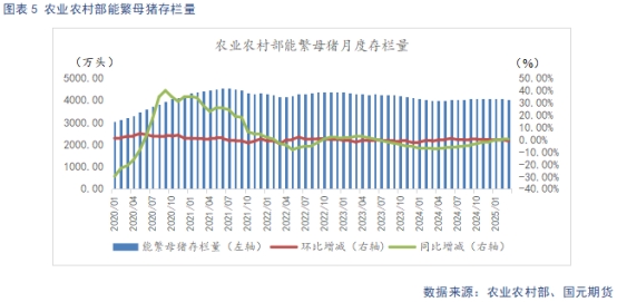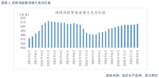 根據(jù)農(nóng)業(yè)農(nóng)村部數(shù)據(jù)顯示,2025年3月末全國(guó)能繁母豬存欄量4039萬(wàn)頭,同比上升1.2%,環(huán)比下降1%,根據(jù)農(nóng)業(yè)農(nóng)村部新修正的《生豬產(chǎn)能調(diào)控實(shí)施方案》,當(dāng)前能繁存欄相當(dāng)于正常保有量的104.6%,處于綠色偏高區(qū)域。24年12月至25年3月期間,能繁母豬存欄有所去化,不過(guò)24年4月至24年11月,能繁母豬存欄逐月環(huán)比回升,以生產(chǎn)周期推算,25年前三季度處于產(chǎn)能兌現(xiàn)期。