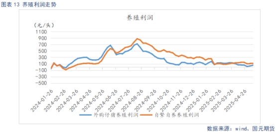 截止5月16日,自繁自養(yǎng)養(yǎng)殖盈利122.23元/頭,盈利較上周環(huán)比擴(kuò)大8.73元/頭。外購(gòu)仔豬養(yǎng)殖盈利56.69元/頭,盈利較上周擴(kuò)大24.99元/頭。豬價(jià)近期小幅走弱,不過(guò)豆粕價(jià)格持續(xù)回調(diào),飼料成本整體回落,養(yǎng)殖端利潤(rùn)有所回升。