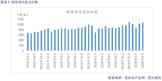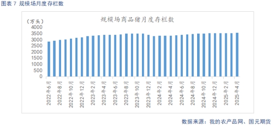 據(jù)Mysteel統(tǒng)計(jì),截止2025年4月底,規(guī)模場(chǎng)能繁母豬存欄量為506.68萬(wàn)頭,環(huán)比上調(diào)0.36%,同比增長(zhǎng)4.31%。4月豬價(jià)平穩(wěn)運(yùn)行,養(yǎng)殖端仍有一定利潤(rùn)空間,去產(chǎn)能意愿不強(qiáng),能繁母豬存欄延續(xù)增長(zhǎng)趨勢(shì)。自24年4月起,養(yǎng)殖利潤(rùn)回暖支撐下,規(guī)模場(chǎng)產(chǎn)能逐步回升,從生產(chǎn)周期推算,2025年規(guī)模場(chǎng)理論產(chǎn)能呈現(xiàn)環(huán)比上升態(tài)勢(shì)。規(guī)模場(chǎng)4月商品豬存欄數(shù)為3548.24萬(wàn)頭,環(huán)比增加0.1%,同比增加6.28%。規(guī)模場(chǎng)4月商品豬出欄量為1085.65萬(wàn)頭,環(huán)比增加4.46%,同比增加26.58%。4月標(biāo)肥價(jià)差逐步縮窄,大豬價(jià)格優(yōu)勢(shì)不再,認(rèn)賣情緒升溫,規(guī)模場(chǎng)完成當(dāng)月出欄計(jì)劃。5月,前期壓欄、二育豬源陸集中出欄壓力較大,出欄量有望延續(xù)增長(zhǎng)。