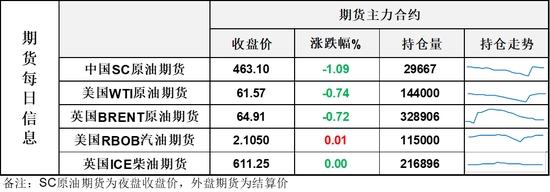 【1】WTI主力原油期貨收跌0.46美元,跌幅0.74%,報61.57美元/桶;布倫特主力原油期貨收跌0.47美元,跌幅0.72%,報64.91美元/桶;INE原油期貨收跌1.09%,報463.1元。