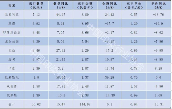 我國印染行業(yè)對主要市場的出口呈現(xiàn)量增價跌態(tài)勢。一季度,我國印染八大類產(chǎn)品對東盟和RCEP貿(mào)易國出口數(shù)量分別增長8.59%和8.45%,出口平均單價分別下滑13.65%和13.14%,降幅均高于行業(yè)出口平均水平。出口數(shù)量排名前十的國家中,僅對俄羅斯出口數(shù)量出現(xiàn)下滑,對其余國家出口數(shù)量均實(shí)現(xiàn)不同程度增長,其中對尼日利亞出口數(shù)量同比增幅達(dá)到44.27%,主要得益于當(dāng)?shù)卣掷m(xù)推進(jìn)的一系列改革措施,包括彌補(bǔ)收入流失、強(qiáng)化機(jī)構(gòu)間合作以及推動貿(mào)易主體自愿遵守法規(guī)等;對巴西、緬甸、巴基斯坦出口數(shù)量增速均超過20%。從出口平均單價來看,對前十國家出口單價平均下降13.31%,其中對越南出口單價下降最為明顯,降幅接近20%,對印度、巴基斯坦和俄羅斯出口單價有所增長。