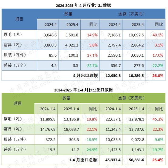 2025年4月,我國羽絨行業(yè)出口總額約1.6億美元,與去年同期相比上漲26.0%,環(huán)比3月漲幅縮小1.1個百分點。分產(chǎn)品來看,除睡袋以外,原毛、寢具、服裝出口量值齊增,其中,原毛出口量同比上漲14.9%,出口額大幅上漲40.5%,出口平均單價有明顯漲幅;服裝出口觸底反彈,量值齊增約17%;寢具出口量值小幅增長約5.8%、3.1%。