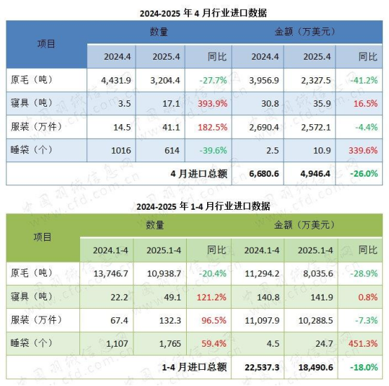 進(jìn)口方面,今年4月,行業(yè)進(jìn)口總額約4946.4萬美元,同比下降26.0%,環(huán)比3月降幅加深7.5個百分點。其中,原毛進(jìn)口量值齊跌,進(jìn)口數(shù)量下滑27.7%,進(jìn)口額下滑41.2%。服裝進(jìn)口數(shù)量大幅增長182.5%,但進(jìn)口額下滑4.4%,進(jìn)口平均單價均大幅下滑。寢具和睡袋進(jìn)口額相對較少。