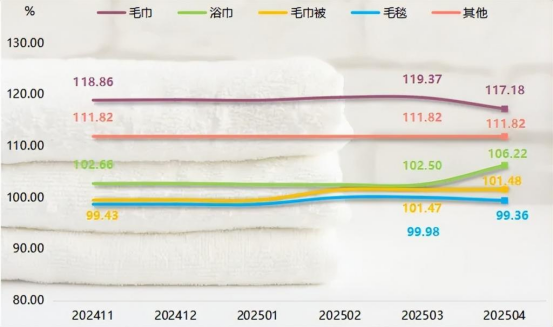 浴巾類、毛巾被類產(chǎn)品價(jià)格指數(shù)表現(xiàn)上漲,且浴巾類產(chǎn)品價(jià)格指數(shù)顯著反彈,是漲勢最為突出的分類,本期指數(shù)收報(bào)于106.22點(diǎn),環(huán)比上漲3.63%,究其原因,消費(fèi)者對舒適性、吸水性、環(huán)保性的要求提高,推動(dòng)企業(yè)研發(fā)更高端產(chǎn)品,成本增加拉動(dòng)浴巾類產(chǎn)品價(jià)格指數(shù)上漲。