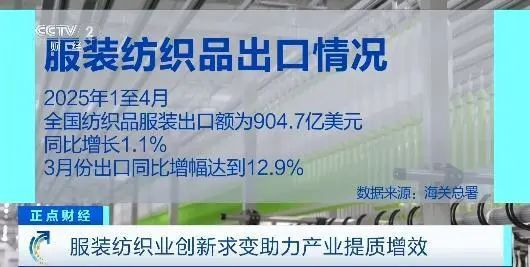 業(yè)內(nèi)人士表示,技術(shù)迭代、產(chǎn)品創(chuàng)新,帶動了我國紡織行業(yè)的持續(xù)增長。今年1至4月,全國紡織品服裝出口額為904.7億美元,同比增長1.1%,其中,3月份出口同比增長加速,增幅達(dá)到12.9%。