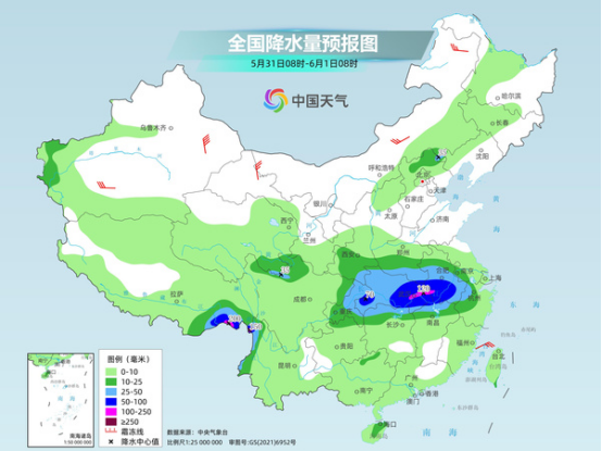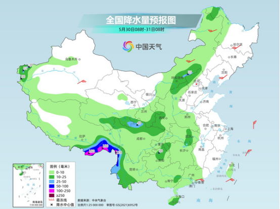 這一輪降雨過程剛剛結(jié)束,新一輪大范圍降雨過程接踵而至。預(yù)計今天到6月3日,自西北地區(qū)東部到南方大部又將出現(xiàn)一輪大范圍降水過程,其中今天,中東部整體以小到中雨為主;端午假期前兩天,長江中下游沿江雨勢最強,多地將現(xiàn)大到暴雨,局地大暴雨;6月2日到3日,降雨將東移南壓至江南南部、華南、西南地區(qū)東南部。