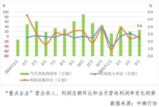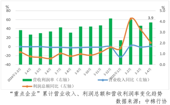 據(jù)中國(guó)棉紡織行業(yè)協(xié)會(huì)跟蹤的重點(diǎn)企業(yè)(以下簡(jiǎn)稱“重點(diǎn)企業(yè)”)數(shù)據(jù), 1-4月份,“重點(diǎn)企業(yè)”營(yíng)業(yè)收入同比增長(zhǎng)1.0%,較1-3月份由負(fù)轉(zhuǎn)增,利潤(rùn)總額增幅較1-3月份大幅回落28.6個(gè)百分點(diǎn),但仍實(shí)現(xiàn)了9.1%的同比增速,帶動(dòng)營(yíng)收利潤(rùn)率維持了3.9%的較好水平,較1-3月份提升0.3個(gè)百分點(diǎn)。