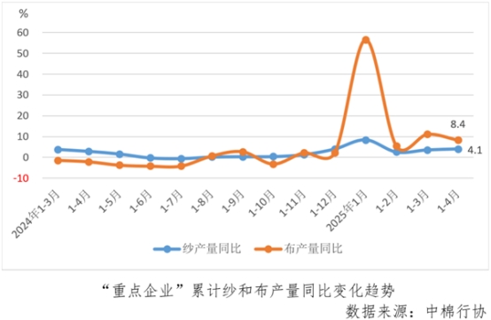 1-4月份,“重點(diǎn)企業(yè)”累計(jì)紗和布產(chǎn)量分別同比增長(zhǎng)4.1%和8.4%,紗產(chǎn)量增速較1-3月份加快0.5個(gè)百分點(diǎn),布產(chǎn)量增速較1-3月份降低2.8個(gè)百分點(diǎn)。4月份紗產(chǎn)量環(huán)比降低9.0%,布產(chǎn)量環(huán)比增長(zhǎng)4.9%。