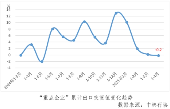 1-4月份,“重點(diǎn)企業(yè)”累計(jì)出口交貨值同比下降0.2%, 較1-3月份增速由正轉(zhuǎn)負(fù)。4月份,美國(guó)宣布對(duì)多個(gè)國(guó)家和地區(qū)大幅加征關(guān)稅,擾亂全球經(jīng)貿(mào)秩序。 中棉行協(xié)跟蹤的“重點(diǎn)企業(yè)”均為棉紡織企業(yè),產(chǎn)品主要為紗和布,作為紡織服裝產(chǎn)業(yè)鏈的中間品,直接出口到美國(guó)的比例極低,受復(fù)雜外部環(huán)境的影響不是很明顯。