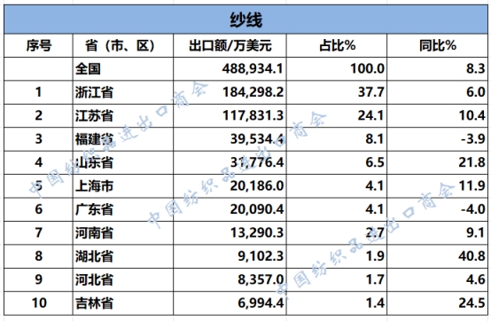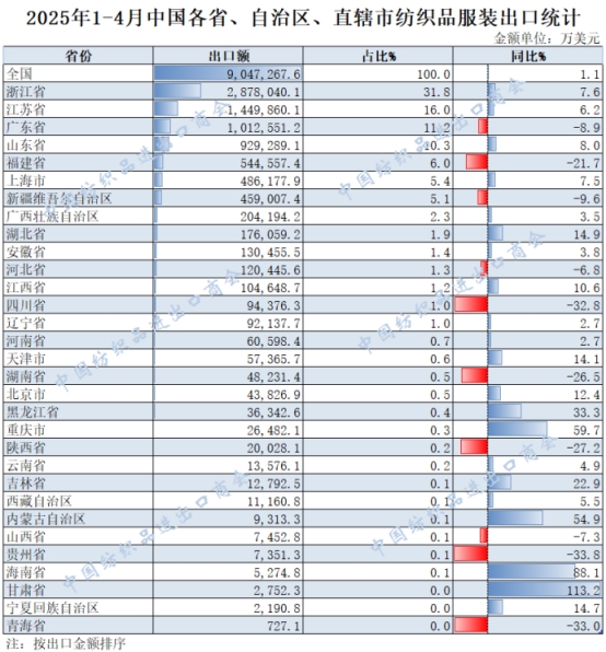 2025年1-4月,我國紡織服裝累計出口904.73億美元,同比增長1.1%。浙江省、江蘇省、廣東省、山東省、福建省分別列全國紡織服裝出口省市前五位,合計比重超七成。
