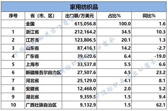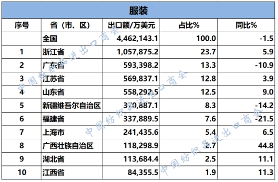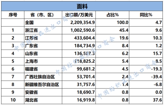 2025年1-4月紡織服裝類重點商品出口前十名的省(市、區(qū))